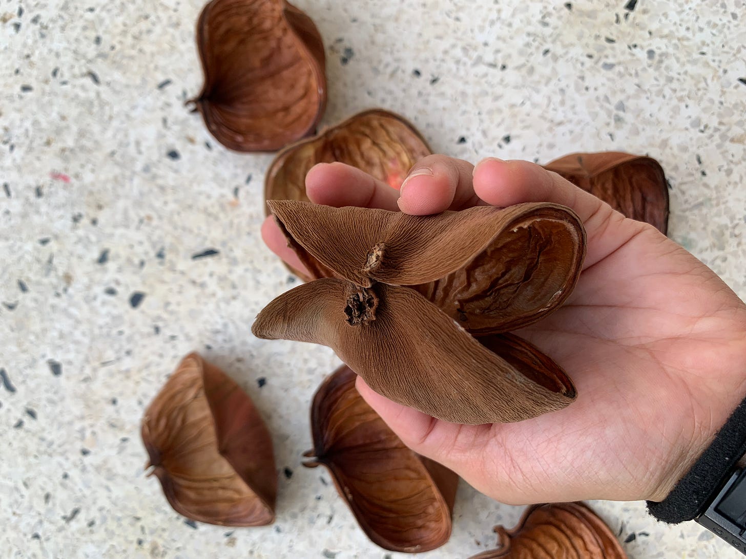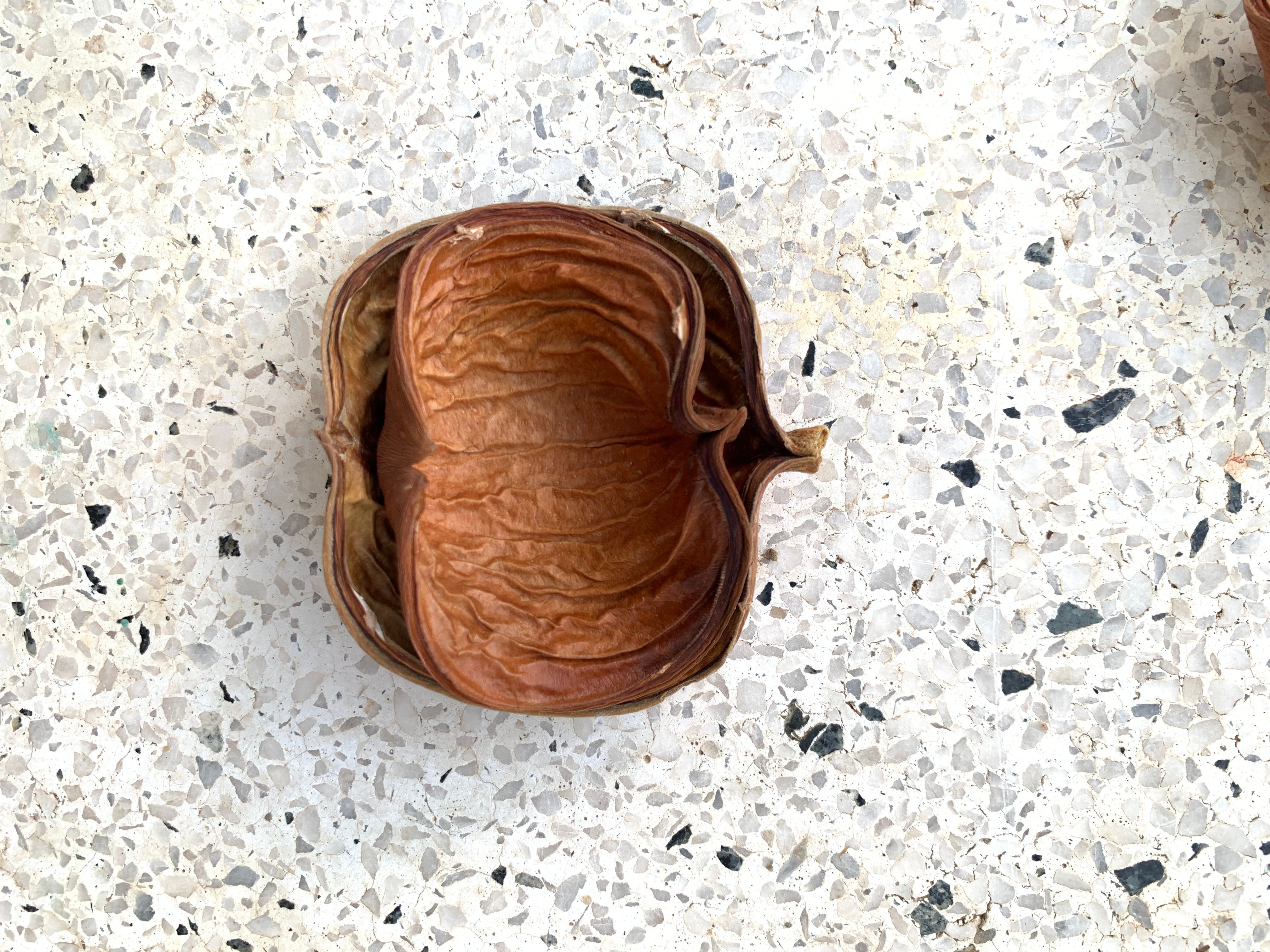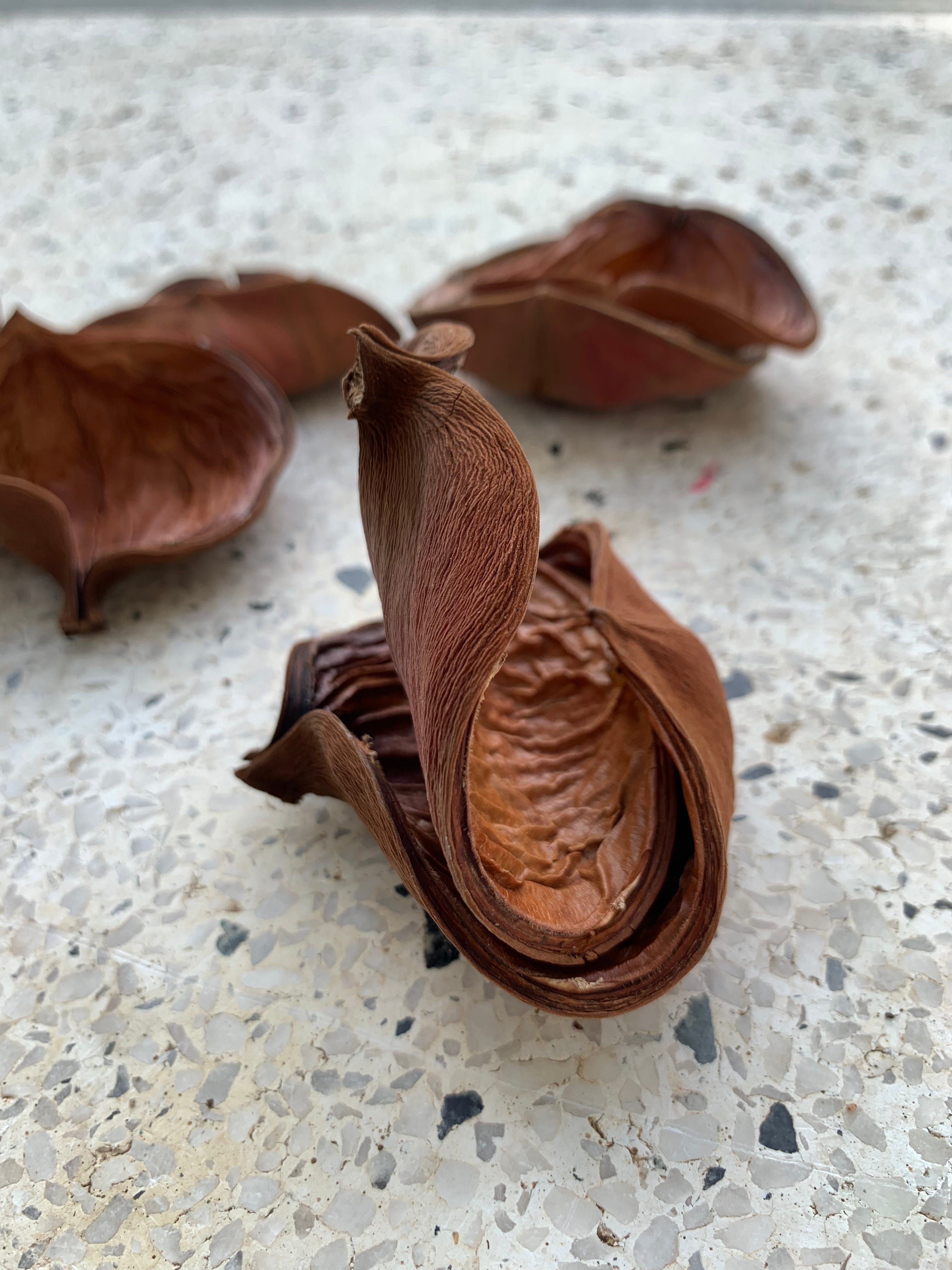 On my daily walks around the neighbourhood in Bayshore, in the Eastern coastal part of Singapore, I had been picking up anything that draws my attention. Like a child, I picked up leaves, branches, dried fruit, and an abundance of my chosen material for this residency - sterculia cordata fruit halves.