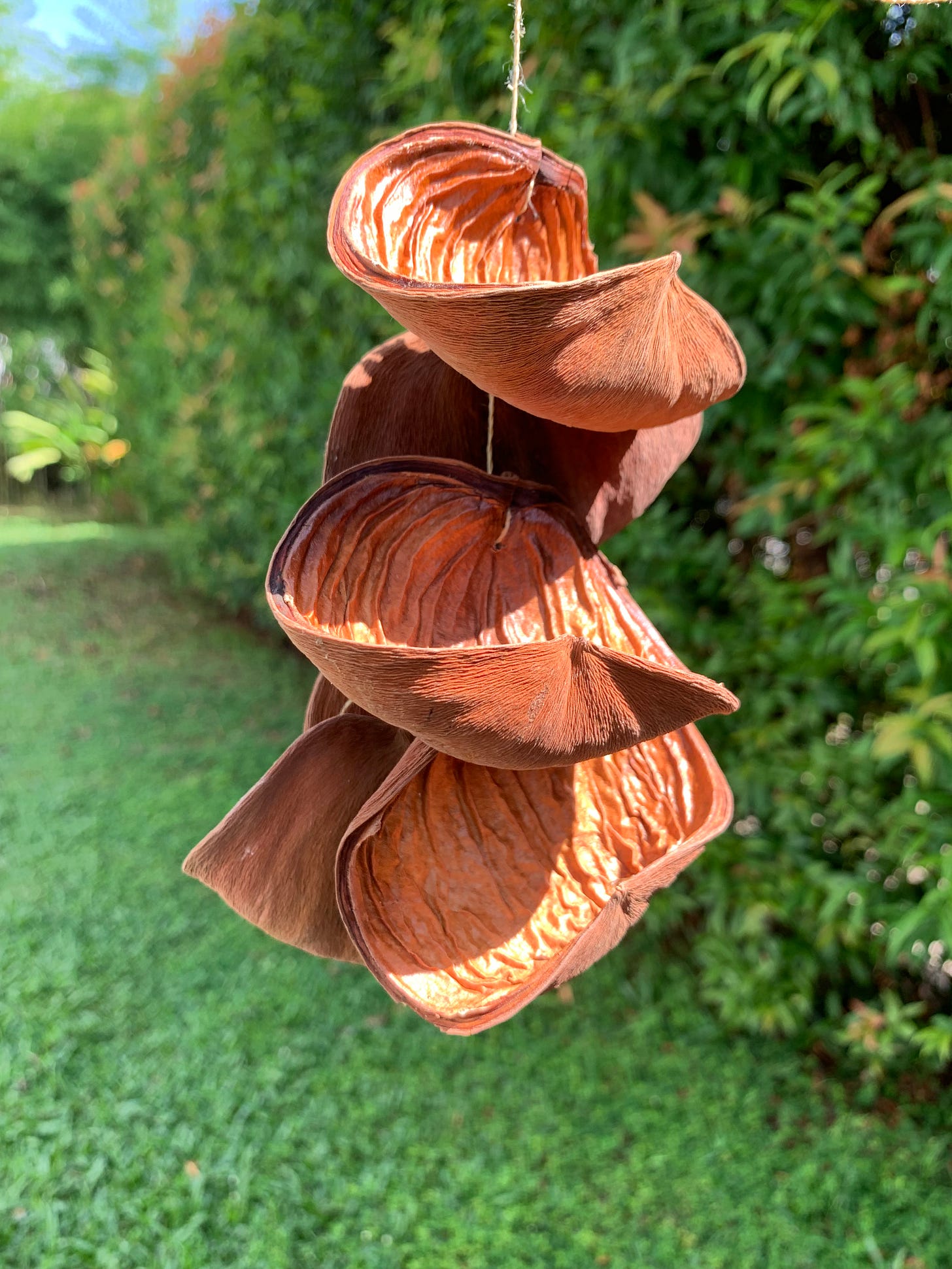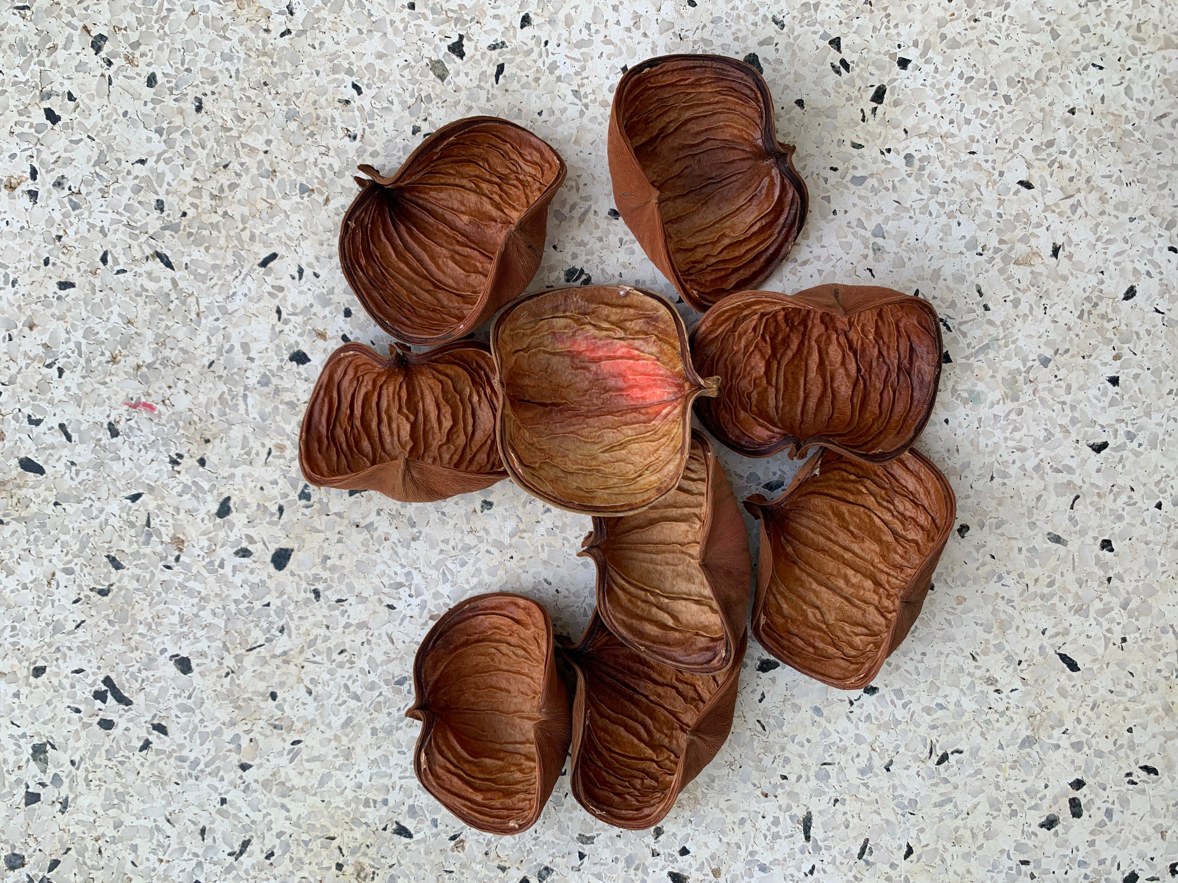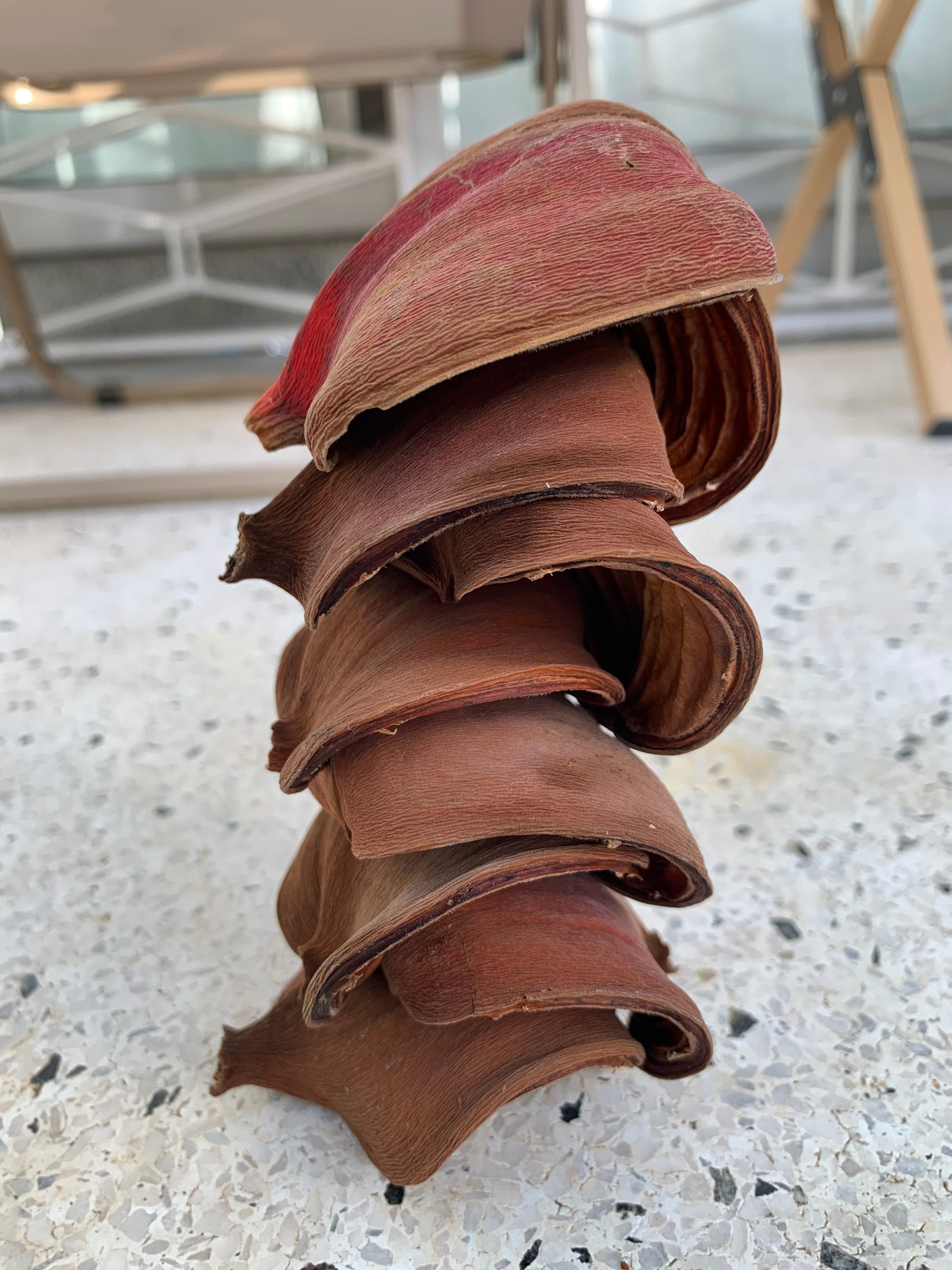 On my daily walks around the neighbourhood in Bayshore, in the Eastern coastal part of Singapore, I had been picking up anything that draws my attention. Like a child, I picked up leaves, branches, dried fruit, and an abundance of my chosen material for this residency - sterculia cordata fruit halves.