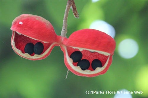 Sterculia cordata or Kelumpang is a native tree of Singapore. Leaves are egg to spoon or broadly elliptic leaves with a heart-shaped base, dense star-like hairs are found on the underside. Drooping clusters of bell-shaped, 5-lobed flowers, pink, reddish to orange coloured with a dark red centre found at the tip of the branches. The fruit is a red, woody follicle that spilt upon maturity revealing its elliptic dark seeds.