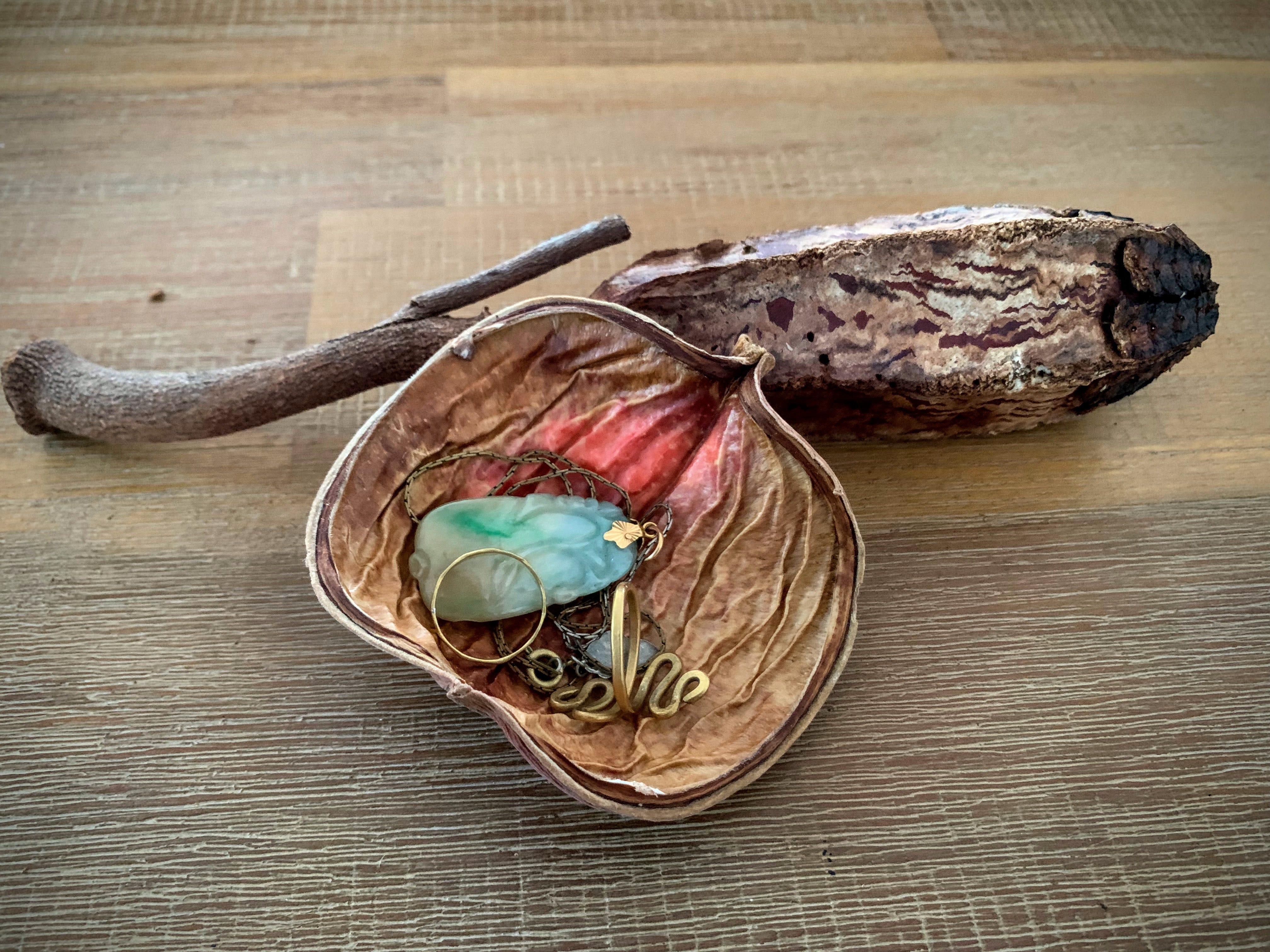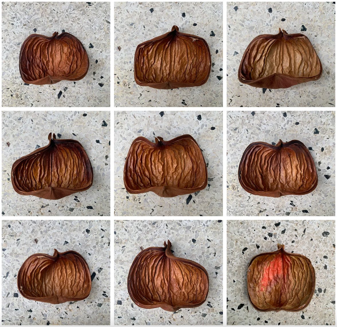 It started as with a fascination with the genetic diversity of sterculia cordata fruit halves, and how their shape and colour evolved as they dried, the plump velvety roundness contorting into different shapes as moisture left the structure. This was inspired by artist-scientist Isabelle Desjeux’s Hevealogy project, which documented the exploded shells of rubber seed pods. The work is about the inquiry process, giving yourself the permission to ask questions and act on them.